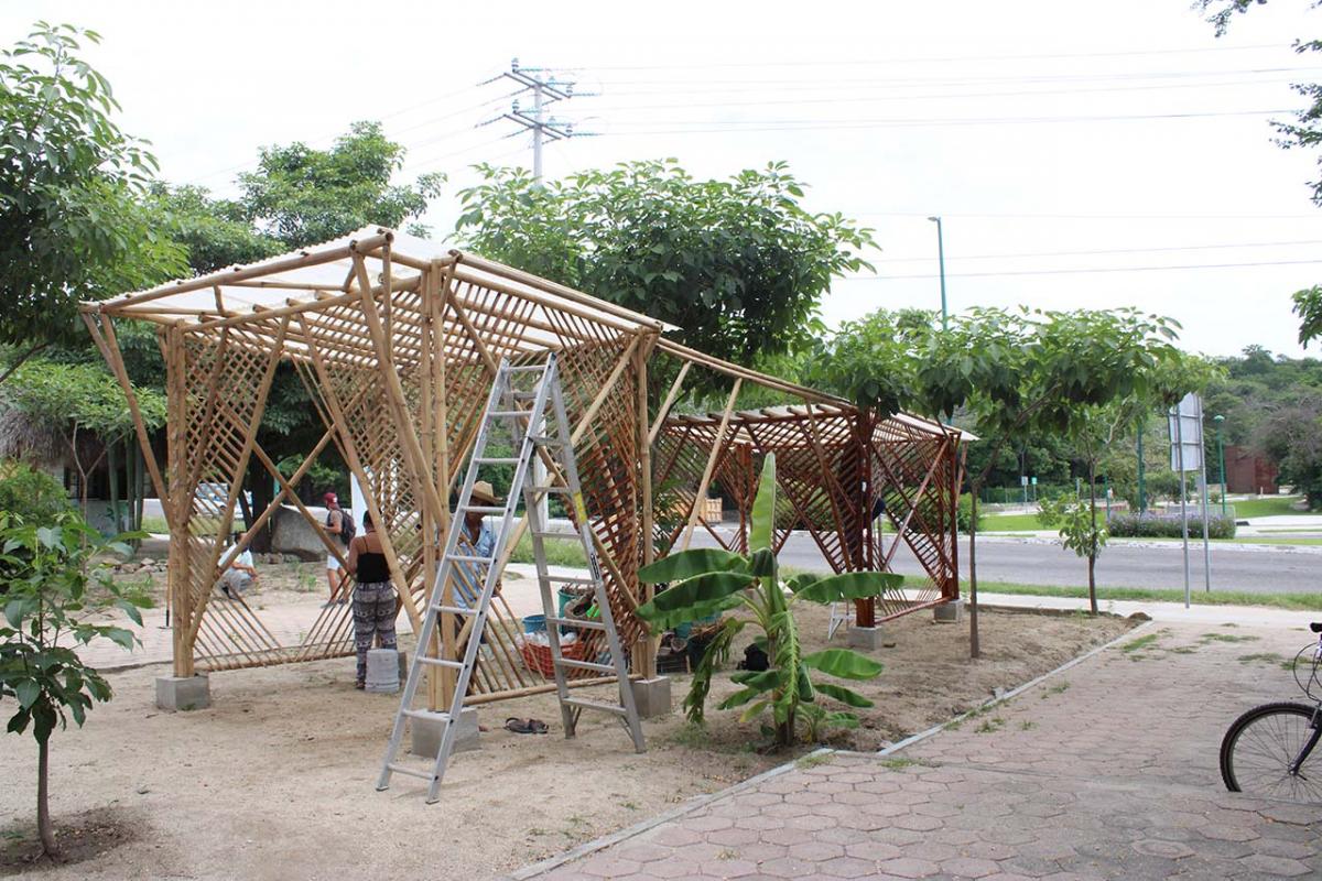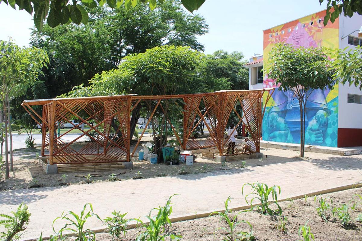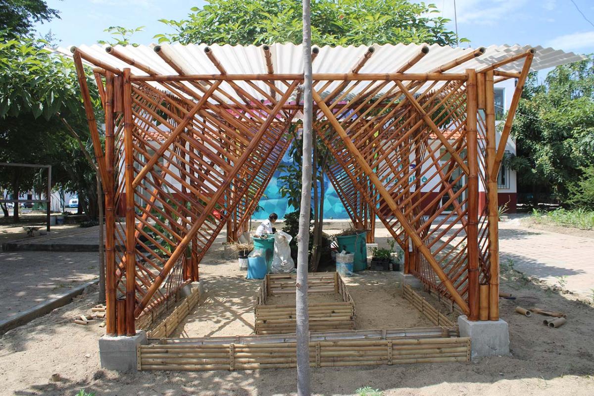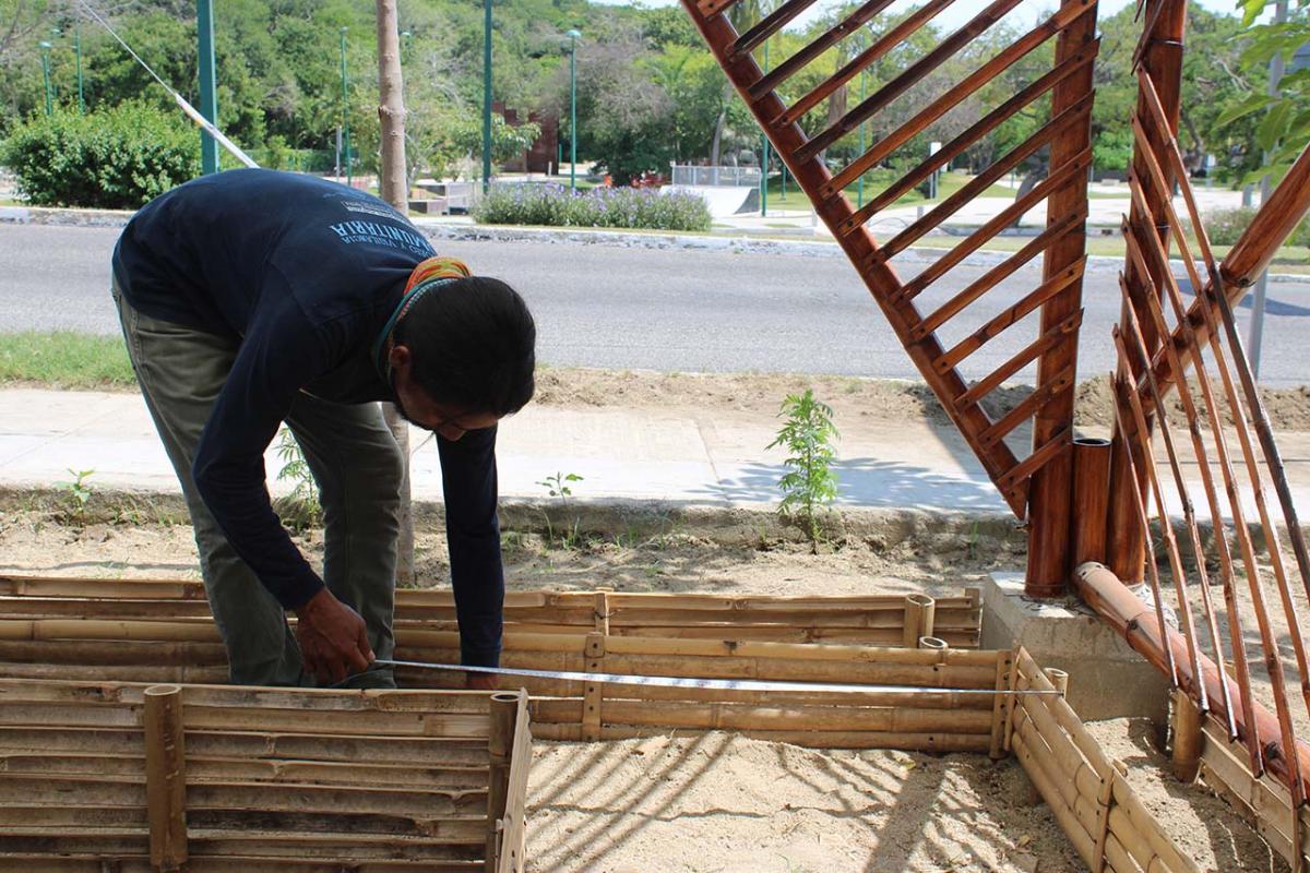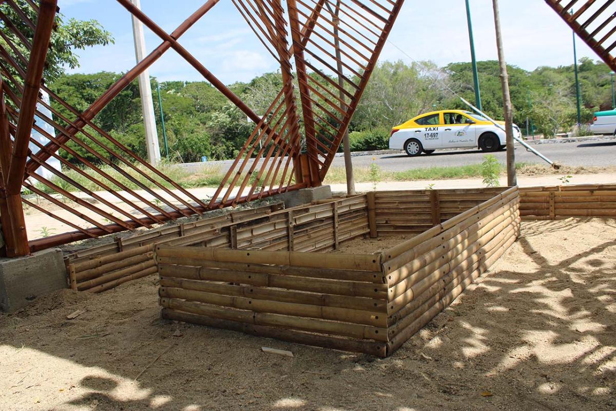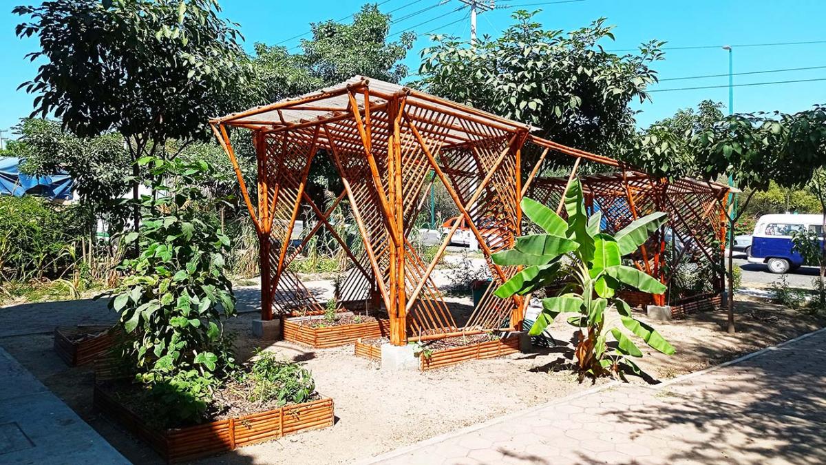 The covered part of the garden was built with local bamboo. The concept comes from Claudio Elias, a bioconstructor architect from Pluma Hidalgo, Oaxaca. Bamboo is a very versatile, fast growing material, ideal for ecological and sustainable construction. It is flexible and resistant, and has a low cost compared to other types of materials. It also has a low energy consumption, which helps bring the project closer to having a green footprint as much as possible.